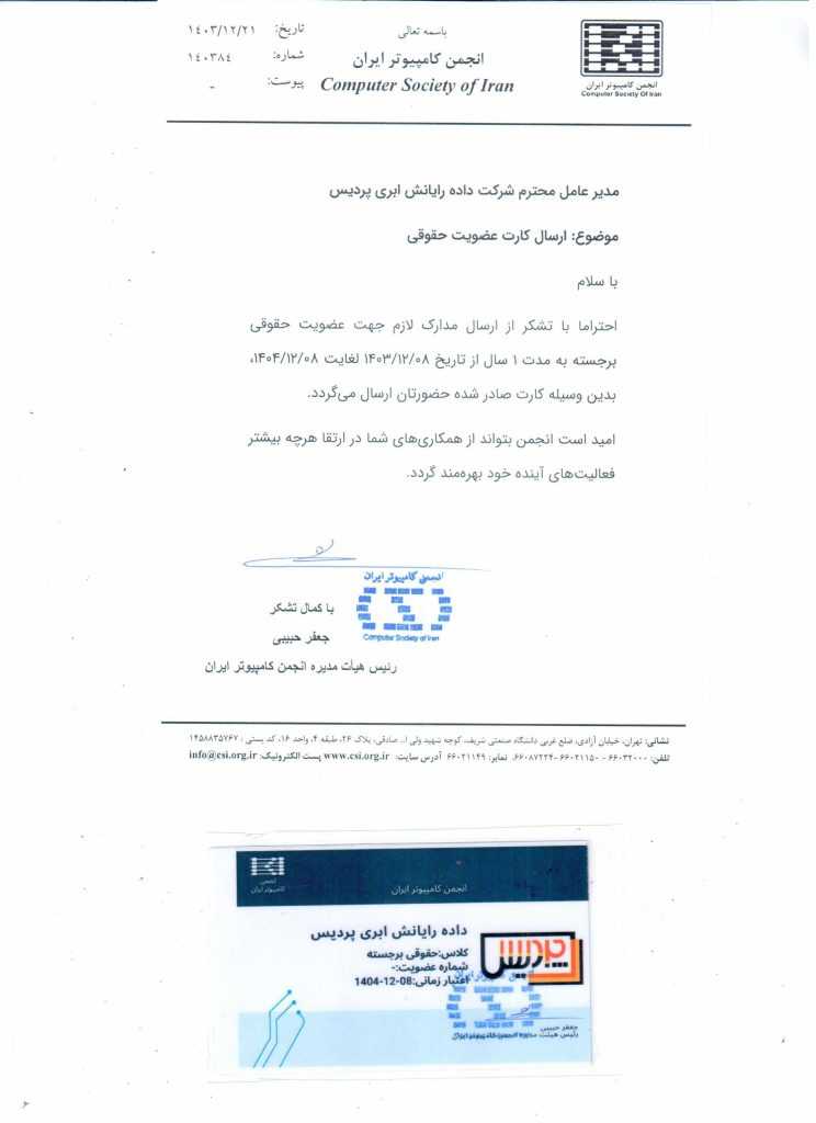 شرکت پردیس دارای عضویت در انجمن کامپیوتر ایران (CSI) میباشد.