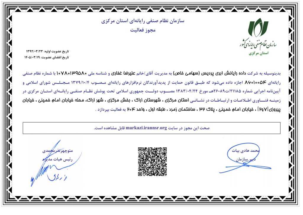 شرکت پردیس مفتخر است که به عنوان عضو رسمی این سازمان، در مسیر توسعه صنعت فناوری اطلاعات کشور نقشآفرینی میکند. پردیسکو دارای مجوز رسمی از سازمان نظام صنفی رایانهای استان مرکزی میباشد.