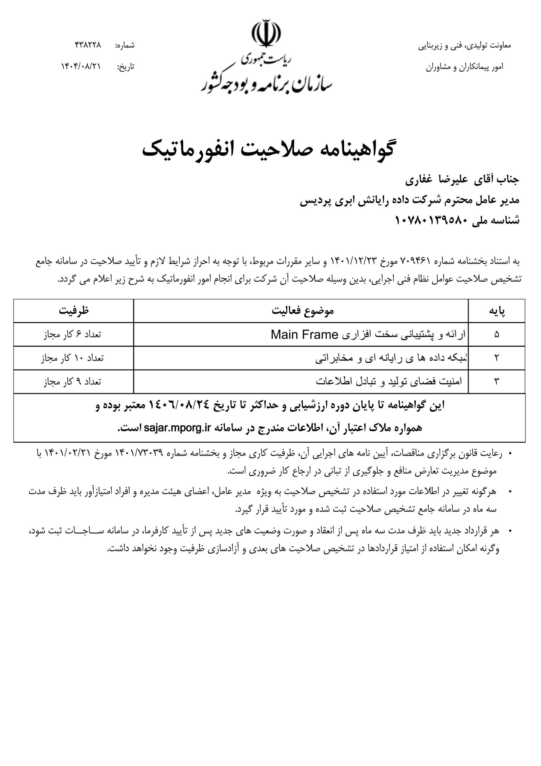 مجوزهای اخذ شده توسط شرکت داده رایانش ابری پردیس (پردیسکو)