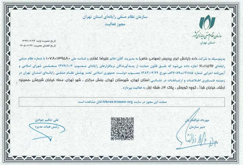 شرکت پردیس مفتخر است که به عنوان عضو رسمی این سازمان، در مسیر توسعه صنعت فناوری اطلاعات کشور نقشآفرینی میکند. پردیسکو دارای مجوز رسمی از سازمان نظام صنفی رایانهای استان تهران میباشد.