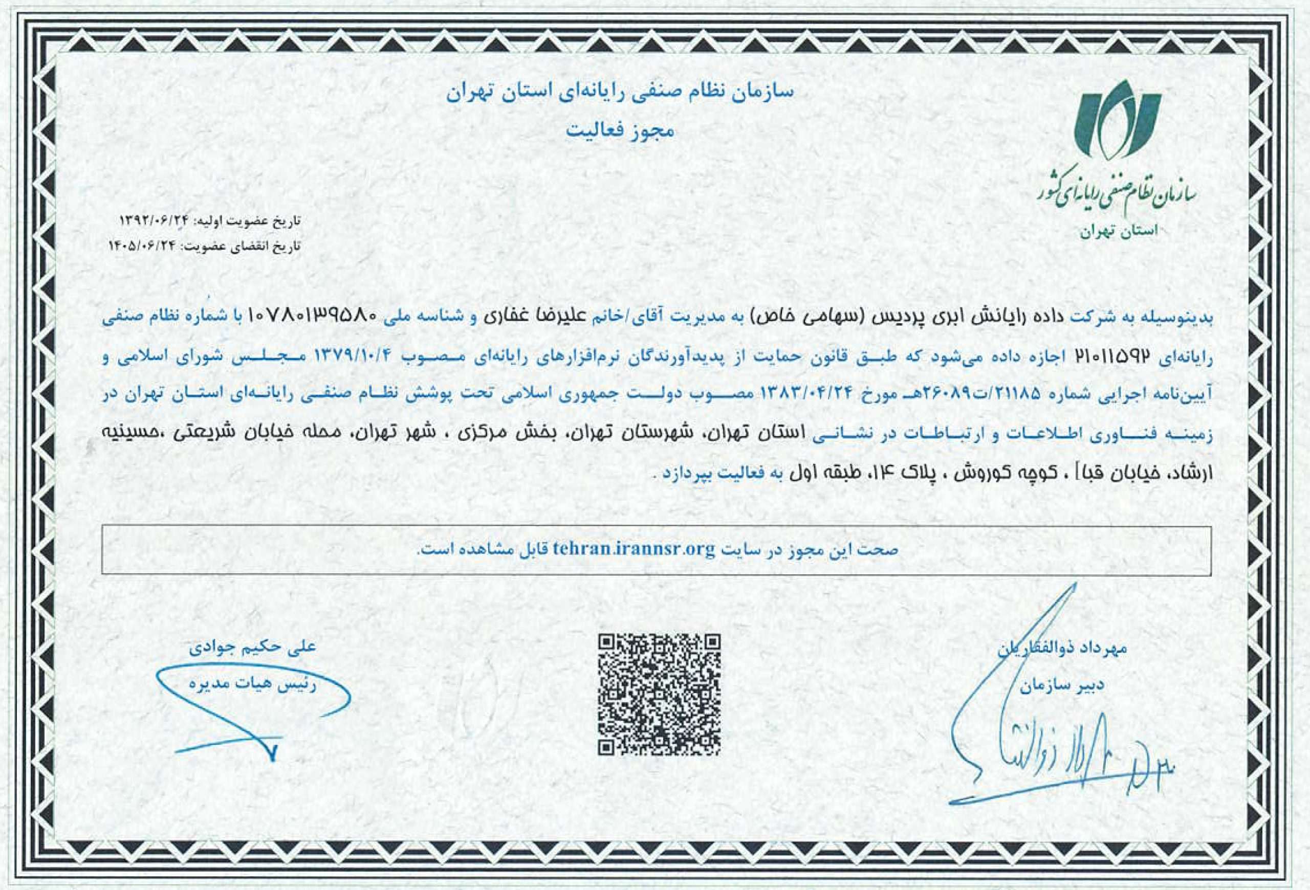 مجوز سازمان نظام صنفی رایانهای استان تهران
